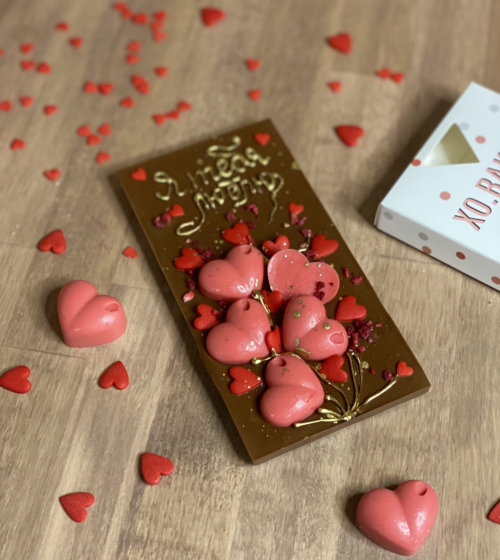 Фирменный шоколад, украшенный россыпью сердец и золотой надписью